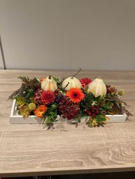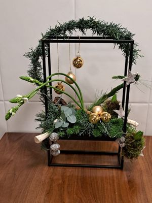 Alle materialen zijn inbegrepen (frame, bloemen, groen en kerstballen).